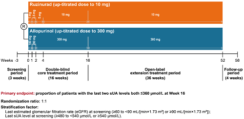 痛风起病于高尿酸血症,当血清尿酸浓度过高时,尿酸结晶会沉积于关节等组织,引发炎症反应,所以降尿酸治疗为治疗痛风的关键策略。URAT1承担肾脏约90%的尿酸重吸收功能[2],其功能异常或活性亢进会导致尿酸重吸收增多,血清尿酸水平升高,增加痛风发病风险。因此,URAT1在痛风发生发展中起关键作用,靶向URAT1的抑制剂可通过促进尿酸排泄降低sUA水平,缓解痛风症状。鲁兹诺雷钠片是AG百家乐医药自主研发的一种高选择性URAT1抑制剂,在前期的一期、二期研究中,鲁兹诺雷钠片耐受性良好,并显示出显著降低高尿酸血症患者sUA的效果[3]。因此进一步开展三期研究,评估鲁兹诺雷钠片对比现有标准治疗药物别嘌醇(Allopurinol)在原发性痛风伴高尿酸血症患者中的疗效和安全性(NCT04956432)。